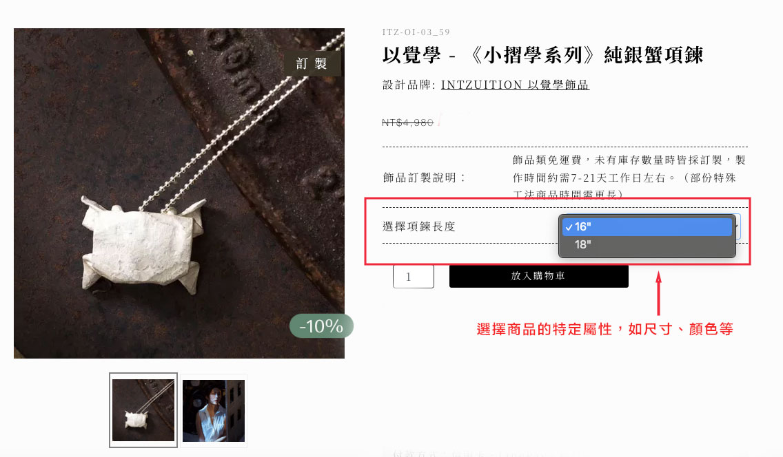 回到商品管理,於新增商品的編輯頁面中找到「規格」欄位,點選+符號加入商品規格,如下圖加入項鍊長度的選項,並先點選儲存。