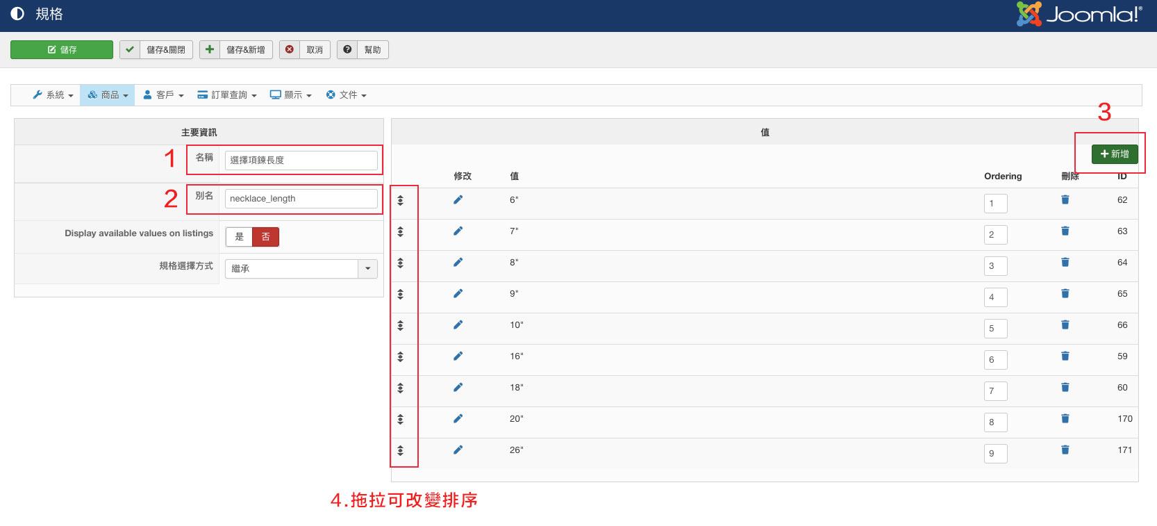 在規格欄位設定中,跟著1~4步驟順序分別新增屬性的名稱及可供選擇的數值。(別名僅供程式判別使用,可直接輸入英文名詞即可。)